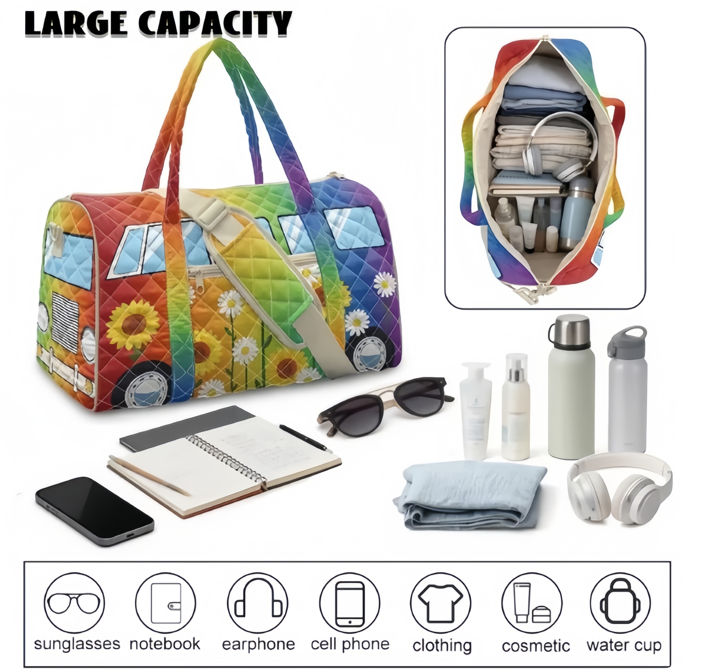 Designed with a vibrant retro van print, rainbow gradient, and cheerful sunflower details, this duffle bag blends eye-catching style with unbeatable practicality. Crafted from premium quilted fabric, it’s soft, durable, and lightweight, making it perfect for weekend getaways, gym sessions, daily commutes, or even as a spacious mom bag.